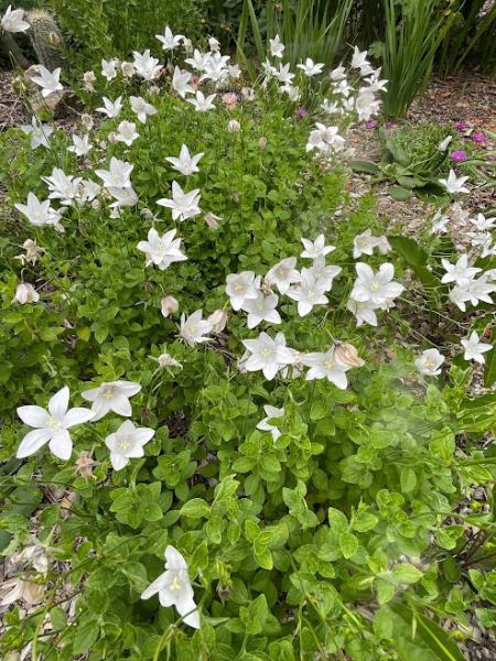 Wahlenbergia undulata is the South African answer to campanula. It has spreading roots that produce masses of blue upturned flowers all summer long. It grows easily from seed or division and is hardy here. It can vary a bit in different localities in South Africa from what appear to be more robust to more gracile forms.