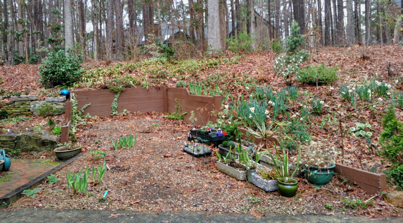 Many bulbous plants prefer the crevice garden. In Raleigh, it’s all too easy for them to rot in heavy clay soil. I’m finally able to keep Cyclamen graecum alive, along with the easier C. hederifolum and C. coum. Species tulips, like Tulipa cretica have also performed well. Galanthus elwesii var. monostictus is happy so far, toward the bottom of a slope, where the bulbs get some extra moisture.