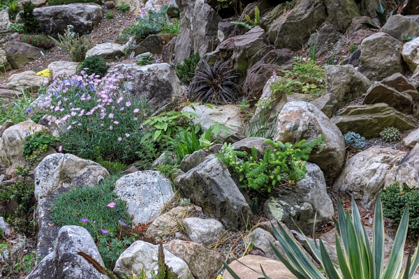 Around the same time, Tony Avent, of nearby Plant Delights Nursery and Juniper Level Botanic Garden in Raleigh, began construction on what was to become an enormous crevice rock garden using “urbanite” or recycled concrete. The early stages were built by others, but most of the construction was done starting in 2017 by Jeremy Schmidt, Grounds and Research Supervisor for Juniper Level. Tony seemed to be trying all the alpines, and a lot of other plants thought to be ungrowable in Raleigh. I was surprised and excited to see that many grew very well indeed in the new crevice garden. Given the drainage and growing medium they needed, these plants were unaffected by the summer heat and humidity.