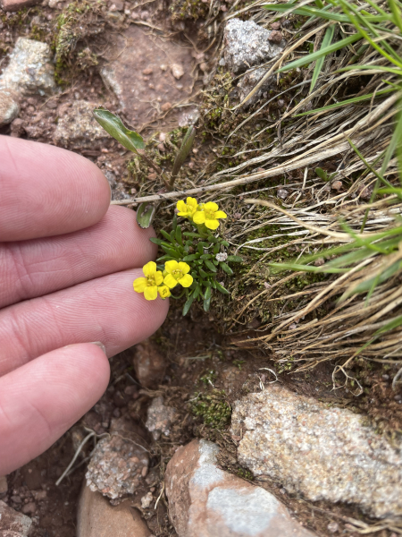 Draba graminea is an adorable little plant endemic to the San Juans. My fingers in the photo give the scale on the individuals we found during the 2021 NARGS conference in Durango. It can make larger mats than the photo shows.