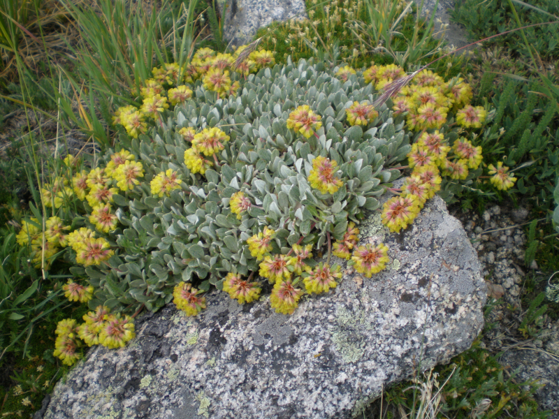 Physaria alpina: The Brassicaceae, or mustard family, is high up there for numbers of endemic plants in cold, high places. Physaria alpina is one of the most attractive members of a genuinely attractive genus. Bright yellow to almost orange flowers surround a silvery rosette of leaves. It has been cultivated in Denver, Vail, and Steamboat Springs. The genus is found in North America, South America, and far eastern Asia.