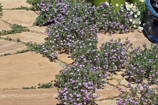 A native plant of great beauty, Lithospermum incisum, turned up on its own as a permanent visitor to the boulder garden. Well worth having, but elusive in my area, I made no attempt to propagate it. At some point, a plant called sand bells (Nama hispidum) seeded itself in two different flagstone walkways. I had no idea where it came from, but it was about as pretty as a “weed” could get. An annual mat-former with purple flowers, it bloomed over a long stretch of time and reseeded every year.