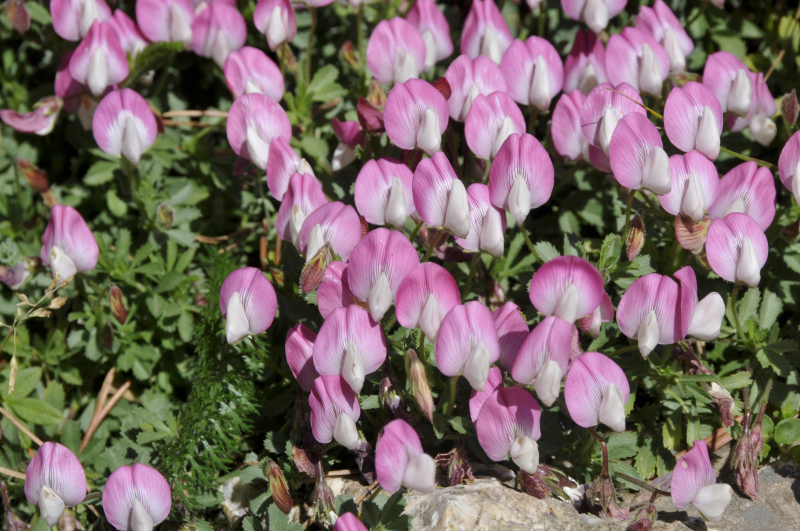 In the Himalayan section, we see all kinds of Primula and a richly flowering plant of Codonopsis clematidea. I saw Swertia petiolata, a plant from the gentian family and totally unknown to me; unlike the European Swertia perennis, this species has white flowers. In the Southern Hemisphere section, Helichrysum milfordiae from South Africa blooms with countless flowers and in perfect condition. Ononis cristata (syn. Ononis cenisia) is a plant from the southern Alps. The common Ononis varieties often produce few flowers, but this variety is nicely compact and the flowers tumble over each other.