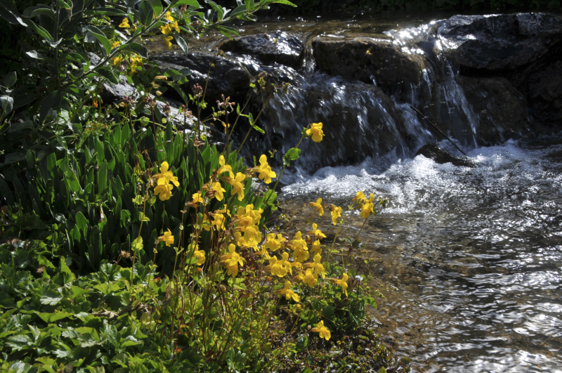 In the shallows of the largest pond near the entrance, many Mimulus bloom. For the botanist, this signals that you are entering the American part of the garden. This soon becomes apparent when you see specimens of Castilleja rhexifolia, perhaps a relic from Ruffier’s time. Castilleja in a European garden are an absolute rarity, and beautiful specimens are in full bloom here. Plants from South America stand in a newly realized area with lava rock. It is still somewhat new, but there are already some of the largest Calceolaria biflora I have seen. Mulinum spinosum, which is present everywhere in Patagonia, also blooms profusely here.