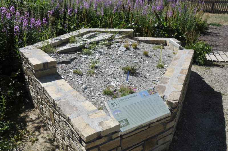 In 2012, the ecole de botanique started. Raised beds have been made here from yellow bricks with an area ranging from three to six square meters (32 – 64 square ft). A narrow stream runs through some beds, while others are completely dry. In each bed, an explanation is given about the adaptations of plants to their growing places. The beds with masonry walls look very artificial, but visitors can easily understand the interaction between plants and their habitat.