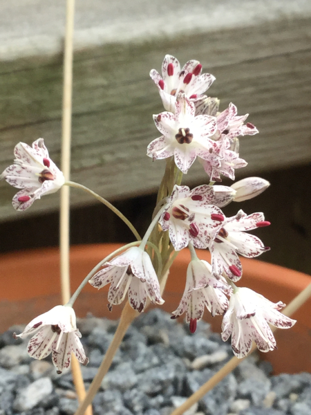I’m also very interested in Allium species, particularly those from Iran and Turkey. Allium materculae is a rarely grown species with a scented pink umbel and beautiful glaucous leaves. Allium shelkovnikovii is another rarity coming from northwestern Iran with flowers of a metallic pink sheen. Both flower in April. Allium callimischon subsp. haemostictum is a real treat with its white flowers marked with red dots on the tepals blooming on dead-looking stalks in early fall. It’s found in Crete and Turkey.