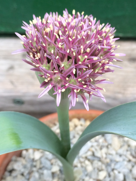 The genus Brunsvigia is bold and spectacular with a widespread distribution in southern Africa. Brunsvigia bosmaniae is a stunner with a huge umbel of bubblegum pink, scented flowers in late summer. In Nieuwoudtville, South Africa, it is a spectacle to behold when they flower en masse. Several different bee species here in the Northern Hemisphere are drawn in to its scent. My bulb is approximately 12 years old. Another species, Brunsvigia namaquana, the smallest in the genus, also flowers in late summer and has unique prostrate leaves covered in bristles. It is native to the quartzite and granite outcrops of Namaqualand. It flowered for the first time last year and I’m hoping for a repeat performance. Brunsvigia species can be fickle about flowering and do not necessarily do so each year.