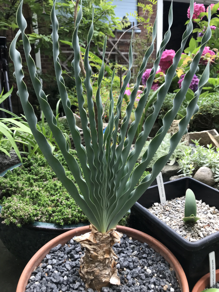 Many years ago, with permission, I collected the seeds of Boophone disticha in the Eastern Cape of South Africa. It is now nine years old and has beautiful glaucous undulating foliage. It has not yet bloomed and usually takes anywhere from 10-12 years to flower from seed. I am aware of other growers who have flowered it in less time; however, they live in warmer climates where it can be planted in the ground. Another species I collected seed of is Cyrtanthus smithiae. This elegant spiral-leaved species flowers in the summer and is also distributed throughout the Eastern Cape. Strumaria prolifera, called the cape snowflake in South Africa, has striking white campanulate blooms. It is found in the Northern Cape and flowers in late fall. Nerine laticoma subsp. huttoniae flowers in late summer to early fall and has a large umbel of pink flowers. It is one of my favorite Nerine species, reminiscent of the genus Brunsvigia which also comes from the Eastern Cape.