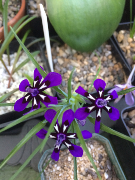 Southern Africa has no shortage of Irids. Lapeirousia oreogena from the Northern Cape has striking purple flowers in February with white and blackish markings in the center.