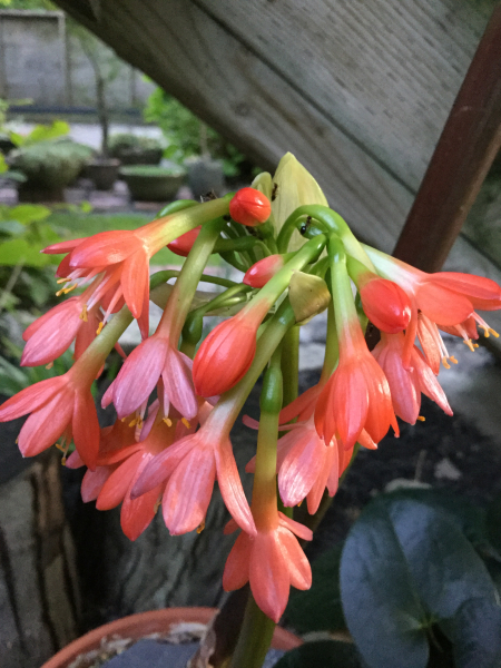 Moving away from southern Africa we have Scadoxus cyrtanthiflorus. This beautiful and highly sought-after species is endemic to the Rwenzori Mountains of Uganda and the Democratic Republic of the Congo. Its long green-and-red tubular flowers resemble some species in the genus Cyrtanthus, hence its specific epithet. It blooms in early autumn.