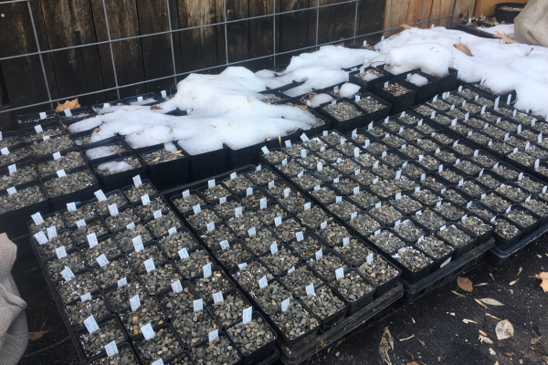 The majority of saxatile and alpine plants require some sort of winter stratification – time when the seed is both wet and cold – to germinate. The same is true of many other perennials. The few exceptions include most grasses, fiber plants (yucca and friends), most cacti, and some, but not all, asters. Those can be sown in spring, in a greenhouse, windowsill, or under lights at their preferred temperatures without pre-treatment. As an exception to an exception, the mountain ball cactus (Pediocactus) needs stratification and thrives being treated like a winter-sown alpine. Most production nurseries, and some hard-core gardeners, do their cold stratification in a refrigerator either as an entire seed tray or as seed in sand or on a wet paper towel in a baggie. This gives you great control but requires perfect timing: once that seed’s little internal clock has counted its needed chilling hours, it germinates in the fridge; and you’d better notice what is happening in that bag next to your butter drawer or the seedlings will etiolate and die. Outdoor winter sowing allows seed to get enough – or more than enough – of their chilling needs and to germinate at the ideal spring temperatures it prefers.