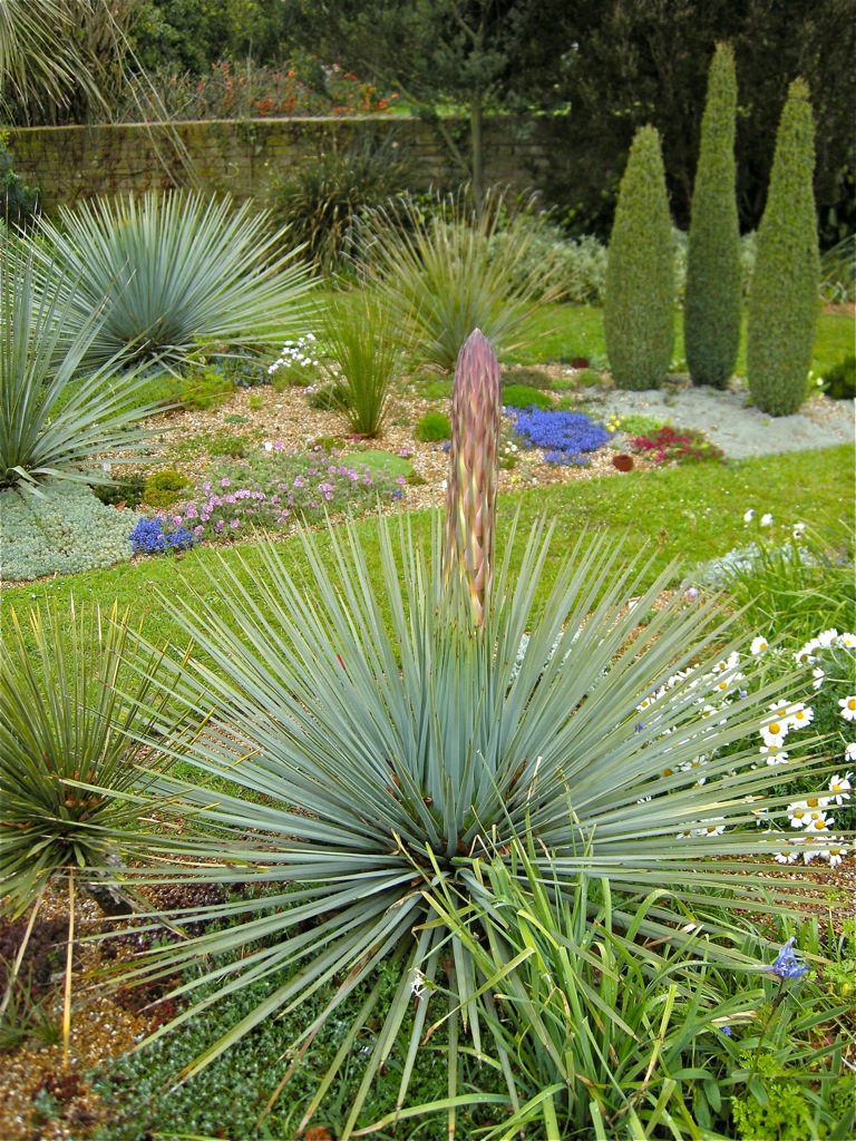 Wed, 05/30/2012 - 12:46amI'm afraid I might fall off onto the rosette of leaves Trond! This picture was taken a day or twoo later with the lovely Lithodora x intermedia in the foreground. Behind the yucca is something even taller, a glaucous leaved form of Ferula communis, still a little off flowering. After particularly mild winters in the past we used to also have giant echiums (pininiana) flowering with the fennel - a sort of Brobdingnagian front garden!