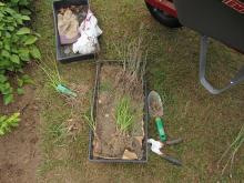 Methodically digging out and separating salvaged Allium plants, to have roots cleaned of invading weeds, and replanted.