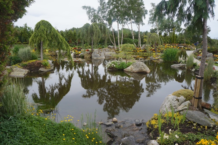 The garden is planted with 50000 annuals every year in a framework of trees and shrubs, small lakes, creeks and paths. Some of the exotic shrubs and palms are brought inside during the winter. The climate is mild so some exotics like the old olive tree stay outside all year.