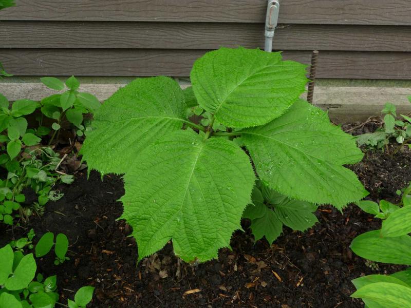 The original owner told me he thought it is a hybrid (caerulea/bifida), so I thought it was a cultivar. But he also said he got it from Plant Delights many years ago, and on their web site, they use Blue Wonder as a common name for the species Deinanthe caerulea. It's a bit ambiguous, though. So, it must be a different form than my other Deinanthe (from Chen Yi). Both have single hairs on both sides of the leaves, and corymbose (rather than umbellate) cymes. both of these characteristics distinguish it from D. bifida. Whether or not the leaf is bifid seems to not be important.