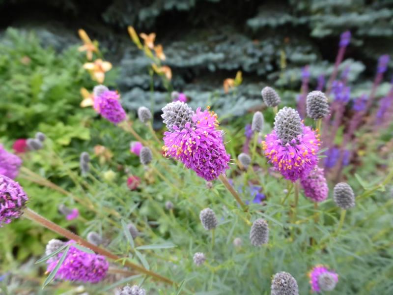Ruellia humilis, Stachys monieri 'Hummelo' and Penstemon pinifolius. In the background you can see the Onopordum stem.