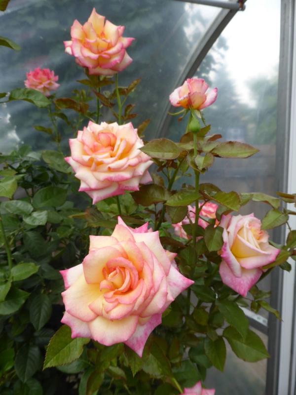 After an extremely heavy first flush, DH's roses in the greenhouse are setting up again. 'Dolly Parton':