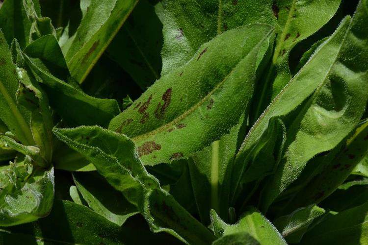 I allow two bristly annuals in the garden: a variegated Humilis sp., and Borage (Borago officinalis).