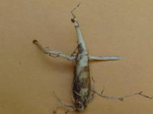 And as I was digging around, I found this: a blue grass stolon had grown right through a bulb!