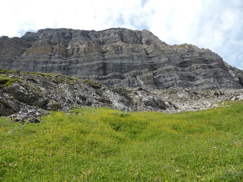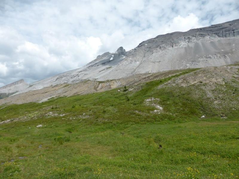 First hint of the alpine views ahead, as the trail swings close to the lower flank of Sparrowhawk Mountain, at about half  way along: