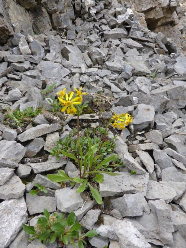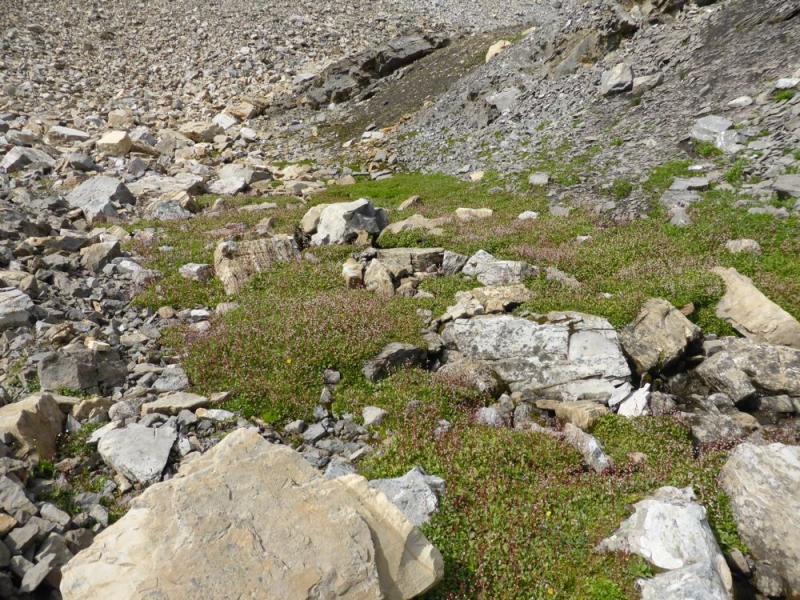 One year, I noticed some sedges(?) with black inflorescences in those areas - not a species I've noted elsewhere in this valley, but not unique.  Can't say I have slogged up to those exact spots though.  I have gone up to the rocky crag where the main snowmelt drainage comes out, above that spot (narrowest part of the scree fan between the rock bands on either side), and seen the same plants as elsewhere in the valley.  But who can say for sure what might be therewithout having gone there?