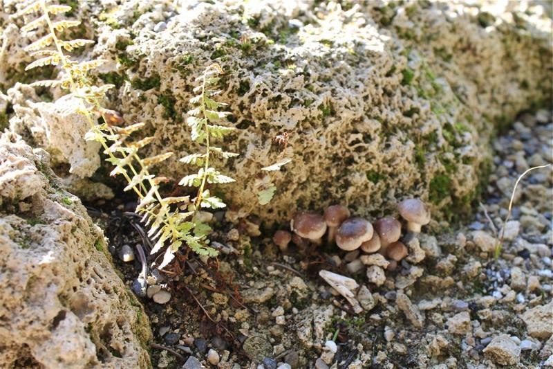 Synthyris pinnatifida v. canescens; Achillea gypsicola; a striped bud coming along on Gentiana vietchiorum (essentially invisible in the photo, sorry!), from seed in 2011; Primula scotica (yet again); Cystopteris fragilis and little mushrooms:
