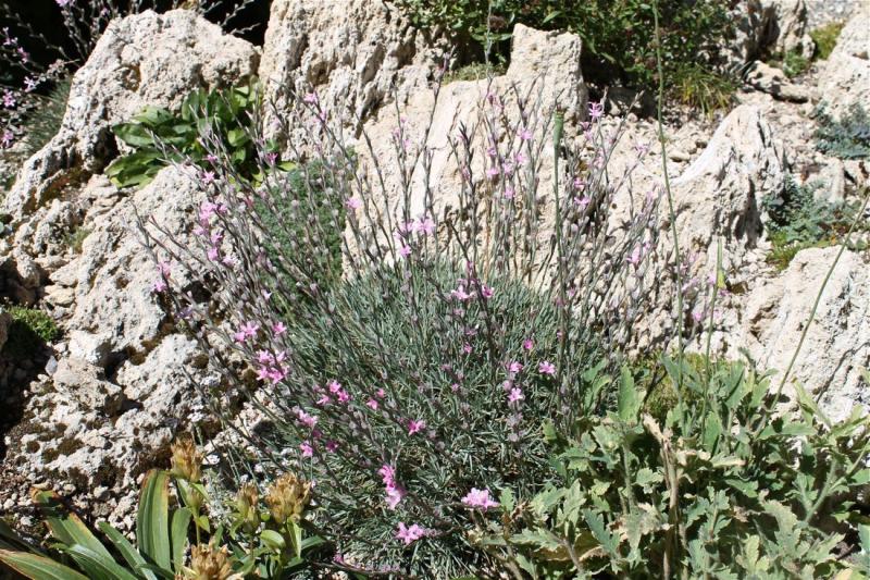 Antirrhinum molle, in its second season in the tufa garden; Anaphalis cf. monocephala, also in its second season; Acantholimon kotschyi ssp. laxispicatum, starting a big bloom: