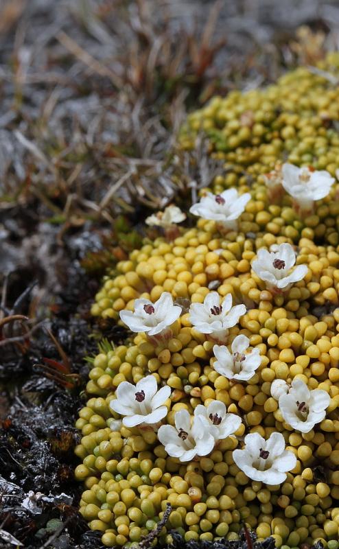 Yellow cushions of Phyllachne rubra and close up.