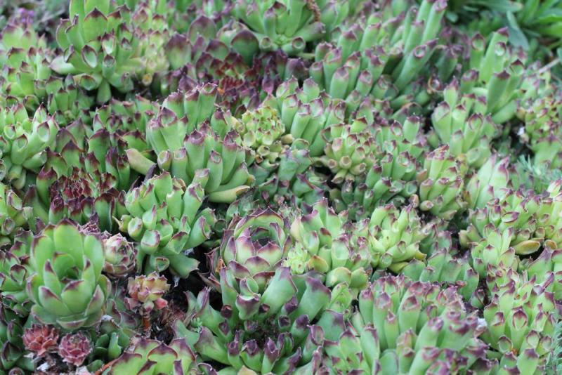 Here are some slightly more mature rosettes of Carduncellus pinnatus (amongst Sempervivum) - you can see the leaf dissection starting: