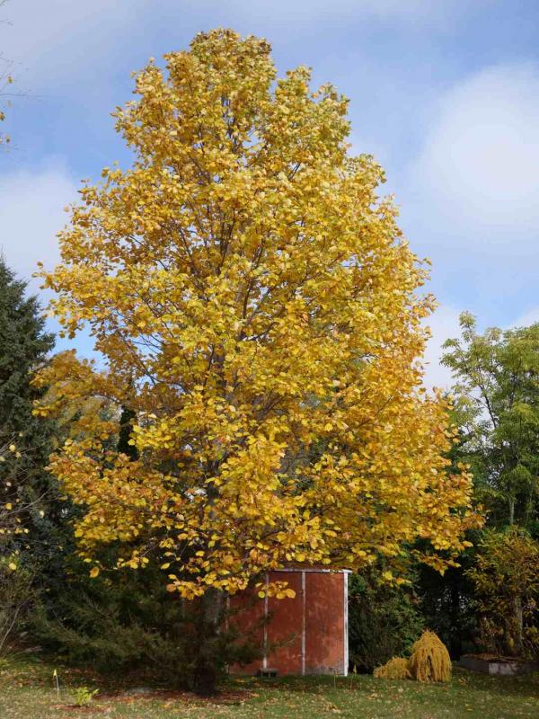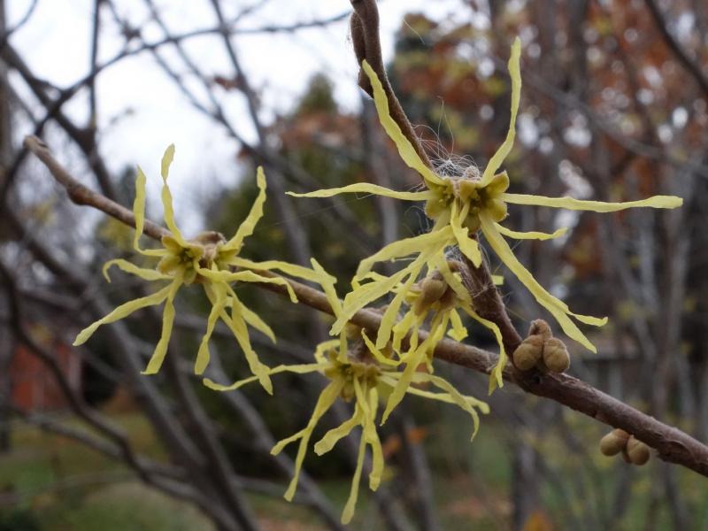 Hamamelis virginiana blooms in late fall and produces its seed the following fall. Liriodendron tulipifera had the best fall color ever in 2014, but has now dropped its leaves. Cotinus obovatus usually has spectacular fall color, first turning maroon, then red, then red-orange. This year it was only red-orange, and only for a week instead of the usual 2-3 weeks.