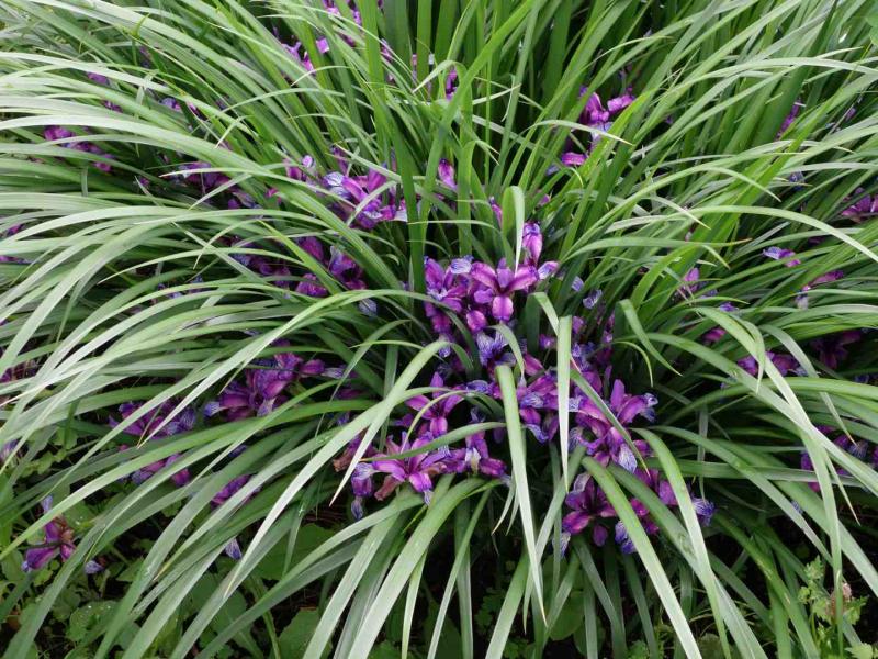Iris graminea and friends, Thalictrum aquilegifolium, Pulmonaria 'Silver Streams', Gentiana tibetica, Lilium michiganense, Impatiens glandulifera, lots of weeds.