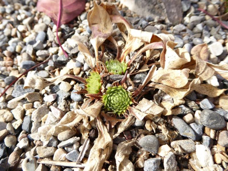 Winter resting rosettes of Androsace spinulifera; Arabis androsacea with a couple of flowers; Androsace chamaejasme: