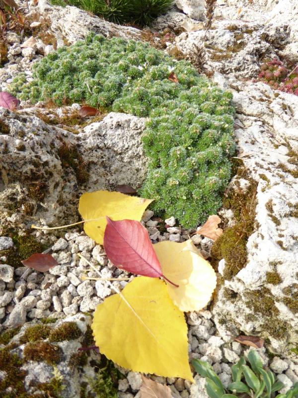 Seedling of Artemisia filifolius - hoping it winters over; a little fall colour on Draba ventosa and unknown Draba sp.: