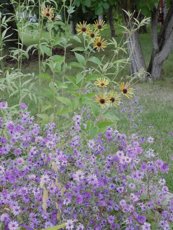 One of our native asters, Symphiotrichum sericeum, and Rudbeckia subtomentosa 'Henry Eilers'. Colchicum x agrippinum