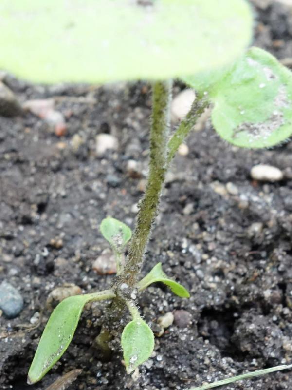 There are two glabrous cotyledons, then two hair oval leaves (juvenile leaves?) that at least appear to be arranged opposite. And then growth explodes with the true leaves and form.