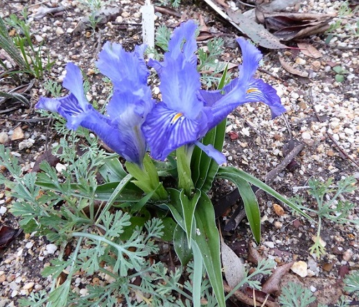 The Juno Iris planifolia is in bloom in a sandy, raised bed,