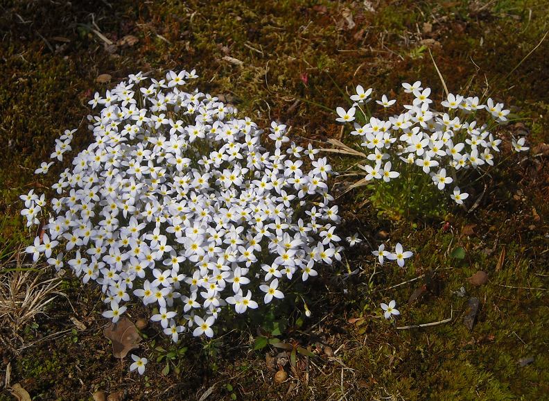 Not all Houstonia caerulea clump up so nice and dense, many grow as wispy little nothings, but those that do tend to grow densely are genetically stable, and make wonderful little cushions that look great all winter. In spring they will flower for more than 2 months, smothered with short-stemmed clouds of white tinged blue.