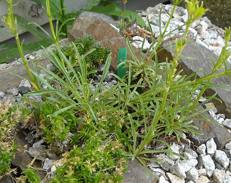 I've been growing this little linear-leaf Penstemon for a few years in a trough, purchased from a New England grower of rock plants. It's not very showy, a few stems with a few tubby violet flowers at a time, never many flowers at once but stretched out over a few weeks. The stems reach about 8" tall. The plant does not match photos I've seen on the USDA site, which I include links for comparison... the leaves on my plant much too narrow compared to USDA photos (see below), and as well, the USDA photos shows flowers spaced much more densely along the stem in congested manner. Any have an idea about what Penstemon species is living in my trough?