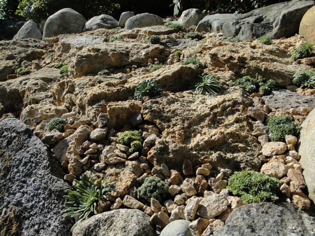 The rocks in the photos below are pieces of tufa laid out in a "crazy paving" pattern to create random crevices. I planted the saxes into the crevices and filled the crevices with pieces of tufa and small rocks that were tufa coloured. The end result I wanted was for the bed to look like one large broken rock outcrop with randomly spaced plants growing in cracks. Later I will also plant some saxes directly into the tufa.