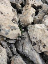 Up and up a steep slope through more talus (our chosen route to get past, actually around, the second headwall)... and tucked in here and there, some plant life: Hooker's Thistle, Cirsium hookerianum; grass-of-parnassus, Parnassia fimbriata, and Arnica sp.;