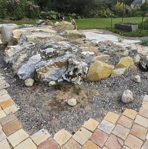 Goshen, CT, is the land of plenty... well, of rocks. When they met, Rod had a background of fine wood and stone fabrication. Elisabeth had been running the NARGS Seedex and growing from seed. Each winter as a new crop of rock would freeze/thaw to the surface, Elisabeth would design and Rod would implement new beds.