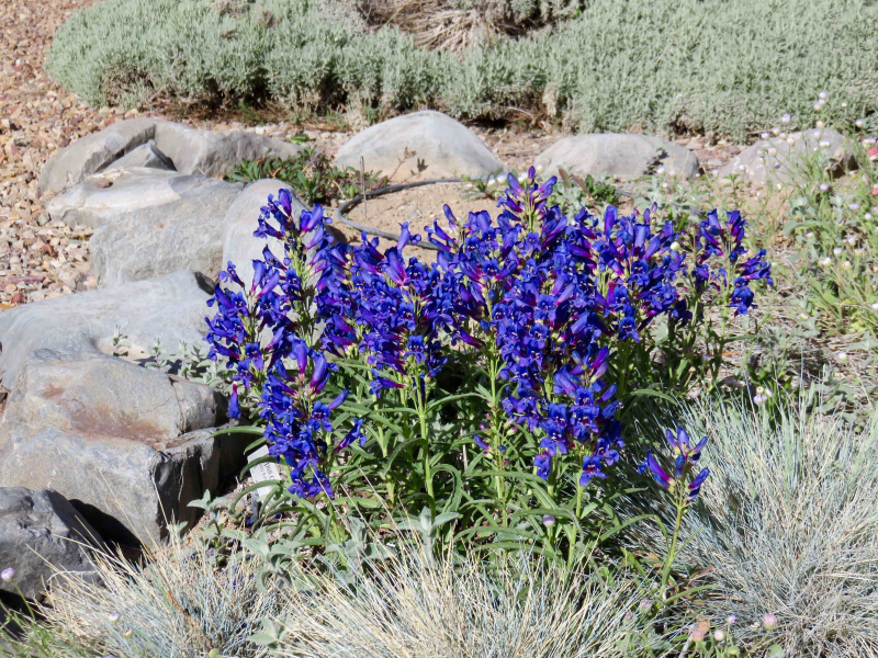A great mat-forming plant, Teucrium aroanium, spread easily with little water. The lilac flowers attracted variegated fritillary butterflies by the dozens (native grassland violets are one of the common larval host plants of this butterfly). This plant has grown readily in Oregon, but it is not as compact or tidy as it was when water-stressed. Not very colorful but an equally easy mat former was Paronychia kapela subsp. serpyllifolia which grows as a green film with tiny white flowers and bracts like tissue paper. Similar in growth habit but much more attractive was Veronica liwanensis, which enjoyed the dry conditions enough to spread into the gravel pathways. Even more colorful was Genista lydia, another reminder of my Maryland garden. As might be expected, several penstemons grew well, including the native Penstemon dasyphyllus and introduced P. barbatus in both its tall forms and dwarf ‘Navigator’ series. I grew several of the larger penstemons but most were too tall for the rock area. The same was true of Salvia, though I did fit S. pachyphylla into the rockery.
