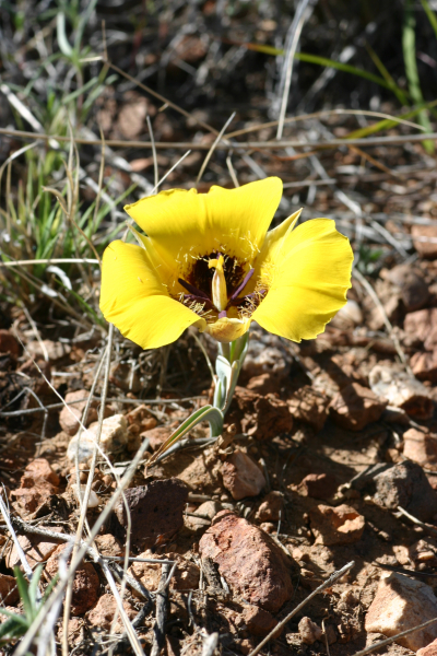 A yellow form of Calochortus kennedyi grew near my driveway in solid clay soil. Oddly, it seemed as if planted in a row. Within 1000 feet of my property a patch of mixed calochortus bloomed, including an orange form of C. kennedyi and white and pink forms of what I believe to be C. ambiguus. I was never quite certain of their identity. I didn’t have the heart (or strength) to attempt transplanting any of these to the rock garden; it would have taken a pickaxe. They were an inspiration where they bloomed!