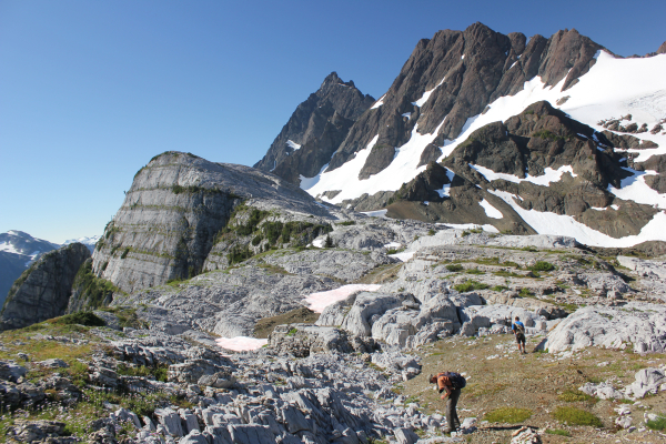 Only about 4% of Vancouver Island is composed of limestone, but the influence of high coastal precipitation levels on the soft carbonate rock results in a diverse karst landscape characterized by caves and underground streams, sinkholes, arches, fossils, and all the other typical karst landforms. Due to the dense forest cover, most of Vancouver Island’s limestone is difficult to see, save the occasional outcrop or cave entrance. However, in a few places, these limestones have been thrust up into the alpine zone above 5000 feet (1500 m), leaving exposed alpine epikarsts. These high alpine occurrences are not huge, ranging in size from 470 acres (190 hectares) on the Clayoquot Plateau to small outcrops of just a few hectares. Some areas are flat and some are super-steep, but they all contribute to plant diversity. All are covered in snow for most of the year and host a distinct and varied flora. Not all limestones are created equal, though all originate on the shallow ancient sea floor and are composed of marine organisms such as corals and seashells. Some are soft, such as dolomite; while others, like marble, become much harder due to heat and pressure. Vancouver Island’s limestones are all referred to as the Quatsino formation, and though dolomite is absent here, a range of consistencies exist.