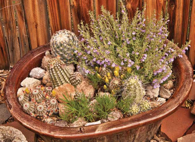 Troughs can be quite beautiful. Santa Fe photographer Charles Mann likens them to jewelers’ cases filled with precious gems, each arrangement unique, depending on the gardener’s tastes and whims. Trough gardens generally contain a collection of plants from diverse regions but from similar habitats. Because they tend to come from harsh environments, these plants share physical characteristics (low to the ground in compact mats, buns, or mounds) that make them visually compatible even if actually from origins as far removed as the steppes of Central Asia and the Great Basin of western America. Combined within the frame of a trough the result can be quite satisfying. Encouraging one or two individuals to spill down the sides, as well as injecting tiny trees, pieces of driftwood and ornamental mineral specimens, help effect a naturalistic and harmonious composition.