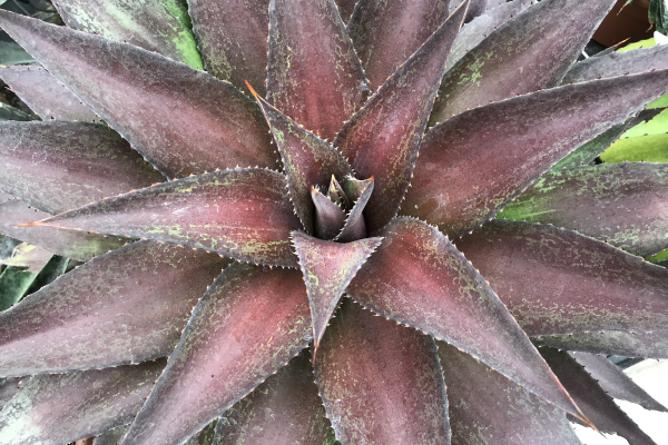 ‘Moonglow’ and ‘Inkblot’ are sister seedlings from the cross between Mangave ‘Bloodspot’ and a Manfreda. This backcross between a Mangave to a Manfreda produced rapidly growing plants with a more flattened growth habit and succulent leaves. They also have a quicker life cycle, flowering in less than three years from tissue culture in the greenhouse. ‘Moonglow’ has the flatter habit of the two, with succulent leaves that are a blend of silver and very dark purple. Very benign spines line the leaf margins of the 6-inch (15 cm) by 24-inch (60 cm) plants. Both selections are quite tender (Zone 9-11) Because of the predominately Manfreda bloodline these siblings have no spines or lethal teeth.