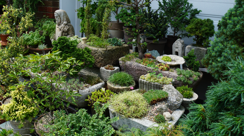 I call my collection of troughs a “troughery” (think fernery, stumpery, rockery). Although I have various plant beds with shrubs, perennials, minimal lawn, and such throughout the front and back gardens, I also have pavement including a driveway up to the patio and garage. It is these paved spaces that I use to stage my trougheries.