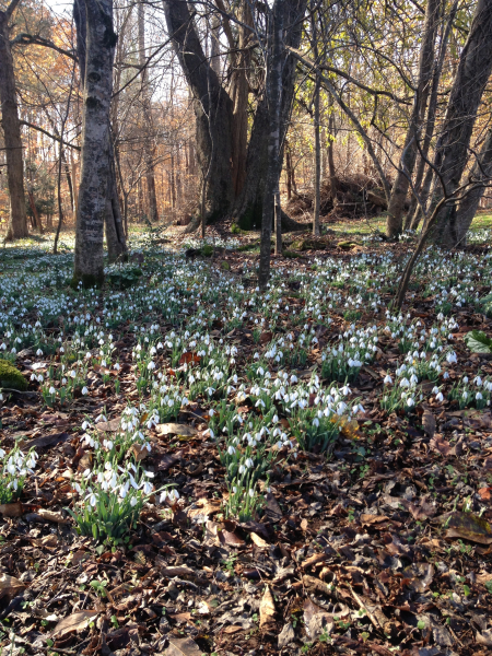 Montrose house is at the top of a fairly steep hill that ends in a broad flood plain bordered by a small river. To control erosion, a Works Progress Administration project in the 1930s installed a series of terraces above the river. To use that history and shape of the land as a design feature, in early January of 2002 I planted a snowdrop walk with Galanthus nivalis at the top of one of the ridges, drawing attention to a curving path almost 300 feet (91 m) long and about 3 feet (1 m) wide. It took me about a month of planting one bulb to a hole to create a “river of snowdrops” that reaches peak bloom in mid-February. These snowdrops grow beneath large tulip poplars (Liriodendron tulipifera) where they have increased quickly for me. After only about 3 years, I had a fine display which could be seen from the more formal areas of the garden.