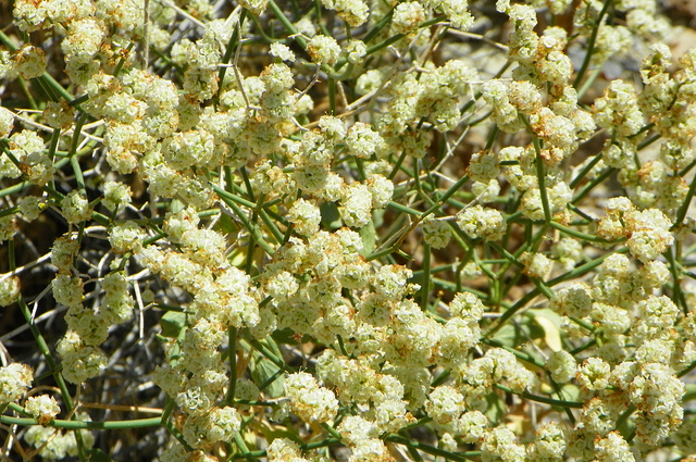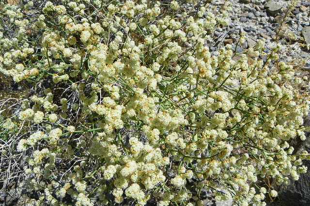 Eriogonum heermannii var. humilius is a domed airy shrub of the sagebrush and saltbrush comunities in the Great Basin. Found growing in the moderatly deep sandy deposites of arroyas and drainages.The bright green stems are heavily branched at all the nodes and the few leaves it has, are located on the lower branches. They drop off early in the heat of summer giving it a stark skeletal appearance. From a distance it looks like a thorny desert dweller. When you give it a closer inspection you realize that it is not armed with spines, just stiff tapered twigs. The plants I have seen are from 12-30 inches tall and as wide as they are tall. They bloom in July opening most of the flowers in a week long flush. As the flowers ripen their seed the flower heads turn a copper color as they desiccate. A dramatic shrub no matter the season.