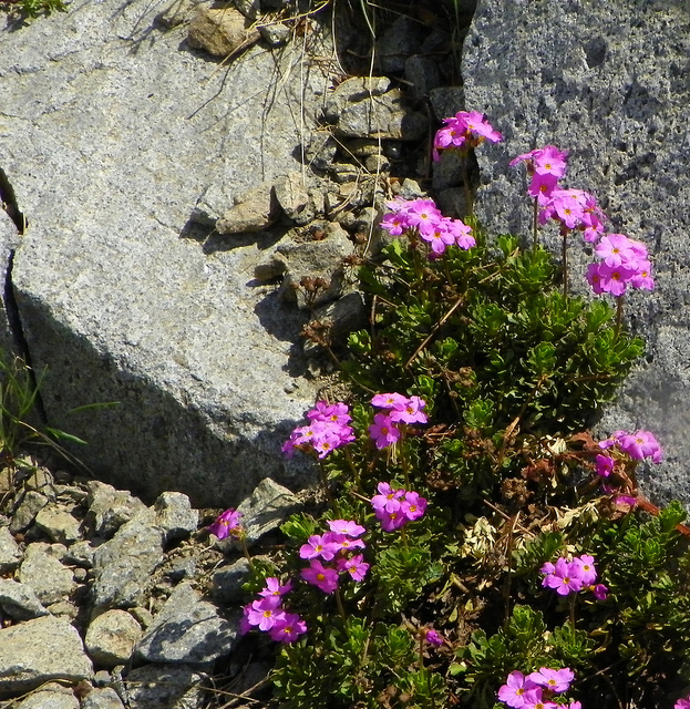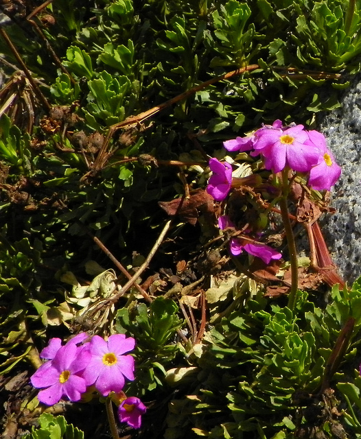 Primula suffrutescens is a Sierra Nevada endemic found at high elevations on damp granitic screes and talus slopes. These seeps are kept moist by melting snow.